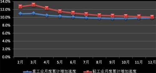 2012年我國重工業(yè)發(fā)展較為平穩(wěn),月度累計(jì)工業(yè)增加值增長率最高為3月的11%,最低為9月的9.7%。長期以來,我國重工業(yè)發(fā)展速度一直快于輕工業(yè)的發(fā)展速度,但受到內(nèi)外經(jīng)濟(jì)增速放緩、內(nèi)需不足等因素影響,2012年我國輕重工業(yè)發(fā)展出現(xiàn)倒置現(xiàn)象。2012年2月,我國輕重工業(yè)工業(yè)增加值月度累計(jì)增加速度為12.7%、10.9%,至12月則發(fā)展為10.1%、9.9%。整體上看,雖然我國重工業(yè)發(fā)展增長速度落后于輕工業(yè),但是其差距在逐步縮小。