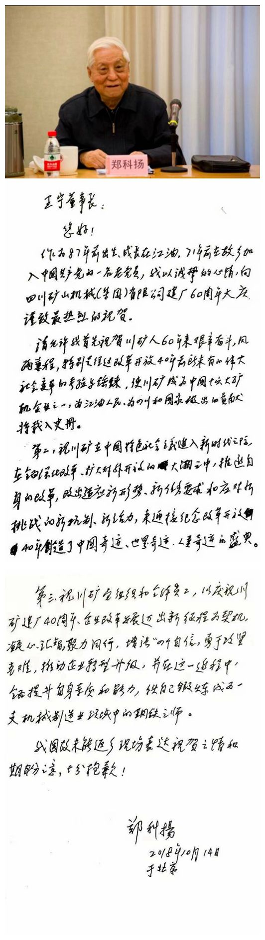 原中組部副秘書(shū)長(zhǎng)、中央政策研究室副主任鄭科揚(yáng)專門為川礦集團(tuán)六十周年華誕發(fā)來(lái)的賀信